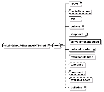 | source | <xs:complexType name="PISchedAdherenceOffSched"> <xs:sequence> <xs:element name="route" type="SCHRouteIden"/> <xs:element name="routeDirection" type="SCH-RouteDirectionName" minOccurs="0"/> <xs:element name="trip" type="SCHTripIden"/> <xs:element name="vehicle" type="CPTVehicleIden"/> <xs:element name="stoppoint" type="CPTStoppointIden"/> <xs:element name="arriveTimeScheduled" type="CPT-DateTime"/> <xs:element name="vehicleLocation" type="lrms:GeoLocation"/> <!-- The real-time location of a transit vehicle --> <xs:element name="offScheduleTime" type="CPT-Duration"/> <xs:element name="tolerance" type="CPT-Duration" minOccurs="0"/> <xs:element name="comment" type="CPT-Footnote" minOccurs="0"/> <xs:element name="available-seats" type="CPT-SeatCount" minOccurs="0"/> <xs:element name="bulletins" minOccurs="0"> <xs:complexType> <xs:sequence maxOccurs="10"> <xs:element name="bulletin" type="PIServiceBulletin"/> </xs:sequence> </xs:complexType> </xs:element> </xs:sequence> </xs:complexType> |
