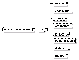 | source | <xs:complexType name="PiServiceListSub"> <xs:sequence> <xs:element name="header" type="CPTSubscriptionHeader"/> <xs:element name="agency-ids" minOccurs="0"> <xs:complexType> <xs:sequence maxOccurs="100"> <xs:element name="agency-id" type="CPT-AgencyID"/> </xs:sequence> </xs:complexType> </xs:element> <xs:element name="zones" minOccurs="0"> <xs:complexType> <xs:sequence maxOccurs="100"> <xs:element name="zone" type="PIServiceZoneIden"/> </xs:sequence> </xs:complexType> </xs:element> <xs:element name="stoppoints" minOccurs="0"> <xs:complexType> <xs:sequence maxOccurs="100"> <xs:element name="stoppoint" type="CPTStoppointIden"/> </xs:sequence> </xs:complexType> </xs:element> <xs:element name="polygon" type="SPPolygon" minOccurs="0"/> <xs:element name="point-location" type="SPPoint" minOccurs="0"/> <xs:element name="distance" type="lrms:Distance" minOccurs="0"/> <xs:element name="modes" minOccurs="0"> <xs:complexType> <xs:sequence maxOccurs="10"> <xs:element name="mode" type="CPT-Mode"/> </xs:sequence> </xs:complexType> </xs:element> </xs:sequence> </xs:complexType> |