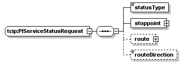 | source | <xs:complexType name="PIServiceStatusRequest"> <xs:sequence> <xs:element name="statusType" type="PI-ServiceStatusType"/> <xs:element name="stoppoint" type="CPTStoppointIden"/> <xs:element name="route" type="SCHRouteIden" minOccurs="0"/> <xs:element name="routeDirection" type="SCH-RouteDirectionName" minOccurs="0"/> </xs:sequence> </xs:complexType> |
