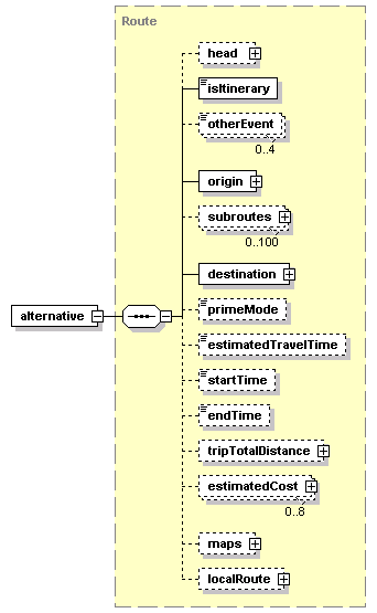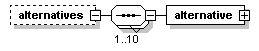 | source | <xs:element name="alternatives" minOccurs="0"> <xs:complexType> <xs:sequence maxOccurs="10"> <xs:element name="alternative" type="atis:Route"/> </xs:sequence> </xs:complexType> </xs:element> |
