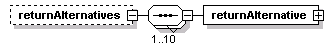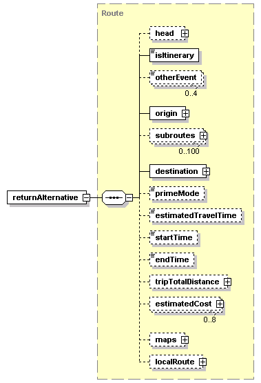| source | <xs:element name="returnAlternatives" minOccurs="0"> <xs:complexType> <xs:sequence maxOccurs="10"> <xs:element name="returnAlternative" type="atis:Route"/> </xs:sequence> </xs:complexType> </xs:element> |