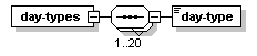 | source | <xs:element name="day-types"> <xs:complexType> <xs:sequence maxOccurs="20"> <xs:element name="day-type" type="SCH-DayType"/> </xs:sequence> </xs:complexType> </xs:element> |