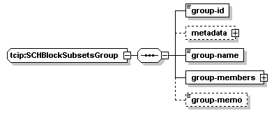 | source | <xs:complexType name="SCHBlockSubsetsGroup"> <xs:sequence> <xs:element name="group-id" type="SCH-BlockSubset"/> <xs:element name="metadata" type="CPTRowMetaData" minOccurs="0"/> <xs:element name="group-name" type="CPT-GroupName"/> <xs:element name="group-members"> <xs:complexType> <xs:sequence maxOccurs="50000"> <xs:element name="group-member" type="SCHBlockIden"/> </xs:sequence> </xs:complexType> </xs:element> <xs:element name="group-memo" type="CPT-Footnote" minOccurs="0"/> </xs:sequence> </xs:complexType> |