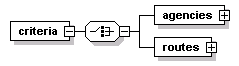 | source | <xs:element name="criteria"> <xs:complexType> <xs:choice> <xs:element name="agencies"> <xs:complexType> <xs:sequence maxOccurs="20"> <xs:element name="agency" type="CPT-AgencyID"/> </xs:sequence> </xs:complexType> </xs:element> <xs:element name="routes"> <xs:complexType> <xs:sequence maxOccurs="100"> <xs:element name="route" type="SCHRouteIden"/> </xs:sequence> </xs:complexType> </xs:element> </xs:choice> </xs:complexType> </xs:element> |