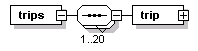 | source | <xs:element name="trips"> <xs:complexType> <xs:sequence maxOccurs="20"> <xs:element name="trip" type="SCHTripIden"/> </xs:sequence> </xs:complexType> </xs:element> |