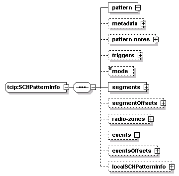 | source | <xs:complexType name="SCHPatternInfo"> <xs:sequence> <xs:element name="pattern" type="SCHPatternIden"/> <xs:element name="metadata" type="CPTRowMetaData" minOccurs="0"/> <xs:element name="pattern-notes" minOccurs="0"> <xs:complexType> <xs:sequence maxOccurs="100"> <xs:element name="pattern-note" type="SCHNoteIden"/> </xs:sequence> </xs:complexType> </xs:element> <xs:element name="triggers" minOccurs="0"> <xs:complexType> <xs:sequence maxOccurs="200"> <xs:element name="trigger" type="SCH-ActivationID"/> </xs:sequence> </xs:complexType> </xs:element> <xs:element name="mode" type="CPT-Mode" minOccurs="0"/> <xs:element name="segments"> <xs:complexType> <xs:sequence maxOccurs="100"> <xs:element name="segment" type="SCHPatternSegmentIden"/> </xs:sequence> </xs:complexType> </xs:element> <xs:element name="segmentOffsets" minOccurs="0"> <xs:complexType> <xs:sequence maxOccurs="100"> <xs:element name="segmentOffset" type="lrms:Distance"/> </xs:sequence> </xs:complexType> </xs:element> <xs:element name="radio-zones" minOccurs="0"> <xs:complexType> <xs:sequence maxOccurs="100"> <xs:element name="radio-zone" type="CPTRadioZone"/> </xs:sequence> </xs:complexType> </xs:element> <xs:element name="events" minOccurs="0"> <xs:complexType> <xs:sequence maxOccurs="200"> <xs:element name="event" type="SCHEvent"/> </xs:sequence> </xs:complexType> </xs:element> <xs:element name="eventsOffsets" minOccurs="0"> <xs:complexType> <xs:sequence maxOccurs="200"> <xs:element name="eventsOffset" type="lrms:Distance"/> </xs:sequence> </xs:complexType> </xs:element> <xs:element name="localSCHPatternInfo" type="local:SCHPatternInfo" minOccurs="0"/> </xs:sequence> </xs:complexType> |