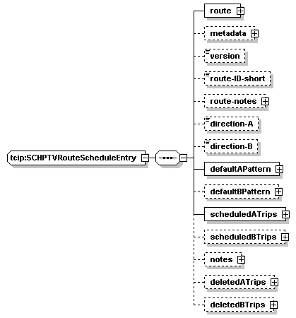 | source | <xs:complexType name="SCHPTVRouteScheduleEntry"> <xs:sequence> <xs:element name="route" type="SCHRouteIden"/> <xs:element name="metadata" type="CPTRowMetaData" minOccurs="0"/> <xs:element name="version" type="SCH-TimetableVersionID" minOccurs="0"/> <xs:element name="route-ID-short" type="CC-RouteIDShort" minOccurs="0"/> <xs:element name="route-notes" minOccurs="0"> <xs:complexType> <xs:sequence maxOccurs="100"> <xs:element name="route-note" type="SCHNoteIden"/> </xs:sequence> </xs:complexType> </xs:element> <xs:element name="direction-A" type="SCH-RouteDirectionName" minOccurs="0"/> <xs:element name="direction-B" type="SCH-RouteDirectionName" minOccurs="0"/> <xs:element name="defaultAPattern" type="SCHPatternIden"/> <xs:element name="defaultBPattern" type="SCHPatternIden" minOccurs="0"/> <xs:element name="scheduledATrips"> <xs:complexType> <xs:sequence maxOccurs="10000"> <xs:element name="scheduledATrip" type="SCHTripInfo"/> </xs:sequence> </xs:complexType> </xs:element> <xs:element name="scheduledBTrips" minOccurs="0"> <xs:complexType> <xs:sequence maxOccurs="10000"> <xs:element name="scheduledBTrip" type="SCHTripInfo"/> </xs:sequence> </xs:complexType> </xs:element> <xs:element name="notes" minOccurs="0"> <xs:complexType> <xs:sequence maxOccurs="2000"> <xs:element name="note" type="SCHNoteInfo"/> </xs:sequence> </xs:complexType> </xs:element> <xs:element name="deletedATrips" minOccurs="0"> <xs:complexType> <xs:sequence maxOccurs="10000"> <xs:element name="deletedATrip" type="SCHTripIden"/> </xs:sequence> </xs:complexType> </xs:element> <xs:element name="deletedBTrips" minOccurs="0"> <xs:complexType> <xs:sequence maxOccurs="10000"> <xs:element name="deletedBTrip" type="SCHTripIden"/> </xs:sequence> </xs:complexType> </xs:element> </xs:sequence> </xs:complexType> |