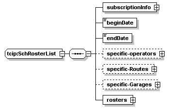 | source | <xs:complexType name="SchRosterList"> <xs:sequence> <xs:element name="subscriptionInfo" type="CPTSubscriptionHeader"/> <xs:element name="beginDate" type="CPT-Date"/> <xs:element name="endDate" type="CPT-Date"/> <xs:element name="specific-operators" minOccurs="0"> <xs:complexType> <xs:sequence maxOccurs="25000"> <xs:element name="specific-operator" type="CPTOperatorIden"/> </xs:sequence> </xs:complexType> </xs:element> <xs:element name="specific-Routes" minOccurs="0"> <xs:complexType> <xs:sequence maxOccurs="100"> <xs:element name="specific-Route" type="SCHRouteIden"/> </xs:sequence> </xs:complexType> </xs:element> <xs:element name="specific-Garages" minOccurs="0"> <xs:complexType> <xs:sequence maxOccurs="100"> <xs:element name="specific-Garage" type="CPTTransitFacilityIden"/> </xs:sequence> </xs:complexType> </xs:element> <xs:element name="rosters"> <xs:complexType> <xs:sequence maxOccurs="25000"> <xs:element name="roster" type="SCHRoster"/> </xs:sequence> </xs:complexType> </xs:element> </xs:sequence> </xs:complexType> |
