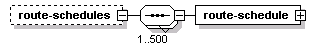 | source | <xs:element name="route-schedules" minOccurs="0"> <xs:complexType> <xs:sequence maxOccurs="500"> <xs:element name="route-schedule" type="SCHPTVRouteScheduleEntry"/> </xs:sequence> </xs:complexType> </xs:element> |