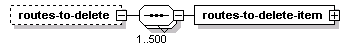 | source | <xs:element name="routes-to-delete" minOccurs="0"> <xs:complexType> <xs:sequence maxOccurs="500"> <xs:element name="routes-to-delete-item" type="SCHRouteIden"/> </xs:sequence> </xs:complexType> </xs:element> |