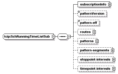 | source | <xs:complexType name="SchRunningTimeListSub"> <xs:sequence> <xs:element name="subscriptionInfo" type="CPTSubscriptionHeader"/> <xs:element name="patternVersion" type="SCH-TimetableVersionID" minOccurs="0"/> <xs:element name="pattern-eff" type="CPT-DateTime" minOccurs="0"/> <xs:element name="routes" minOccurs="0"> <xs:complexType> <xs:sequence maxOccurs="500"> <xs:element name="route" type="SCHRouteIden"/> </xs:sequence> </xs:complexType> </xs:element> <xs:element name="patterns" minOccurs="0"> <xs:complexType> <xs:sequence maxOccurs="5000"> <xs:element name="pattern" type="SCHPatternIden"/> </xs:sequence> </xs:complexType> </xs:element> <xs:element name="pattern-segments" minOccurs="0"> <xs:complexType> <xs:sequence maxOccurs="15000"> <xs:element name="pattern-segment" type="SCHPatternSegmentIden"/> </xs:sequence> </xs:complexType> </xs:element> <xs:element name="stoppoint-intervals" minOccurs="0"> <xs:complexType> <xs:sequence maxOccurs="15000"> <xs:element name="stoppoint-interval" type="SCHStoppointPair"/> </xs:sequence> </xs:complexType> </xs:element> <xs:element name="timepoint-intervals" minOccurs="0"> <xs:complexType> <xs:sequence maxOccurs="1000"> <xs:element name="timepoint-interval" type="SCHTimepointInterval"/> </xs:sequence> </xs:complexType> </xs:element> </xs:sequence> </xs:complexType> |