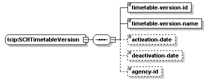 | source | <xs:complexType name="SCHTimetableVersion"> <xs:sequence> <xs:element name="timetable-version-id" type="SCH-TimetableVersionID"/> <xs:element name="timetable-version-name" type="SCH-TimetableVersionName"/> <xs:element name="activation-date" type="CPT-Date" minOccurs="0"/> <xs:element name="deactivation-date" type="CPT-Date" minOccurs="0"/> <xs:element name="agency-id" type="CPT-AgencyID" minOccurs="0"/> </xs:sequence> </xs:complexType> |