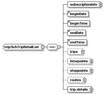 | source | <xs:complexType name="SchTripDetailList"> <xs:sequence> <xs:element name="subscriptionInfo" type="CPTSubscriptionHeader"/> <xs:element name="beginDate" type="CPT-Date"/> <xs:element name="beginTime" type="CPT-Time"/> <xs:element name="endDate" type="CPT-Date"/> <xs:element name="endTime" type="CPT-Time"/> <xs:element name="trips" minOccurs="0"> <xs:complexType> <xs:sequence maxOccurs="100000"> <xs:element name="trip" type="SCHTripIden"/> </xs:sequence> </xs:complexType> </xs:element> <xs:element name="timepoints" minOccurs="0"> <xs:complexType> <xs:sequence maxOccurs="500"> <xs:element name="timepoint" type="SCHTimepointIden"/> </xs:sequence> </xs:complexType> </xs:element> <xs:element name="stoppoints" minOccurs="0"> <xs:complexType> <xs:sequence maxOccurs="25000"> <xs:element name="stoppoint" type="CPTStoppointIden"/> </xs:sequence> </xs:complexType> </xs:element> <xs:element name="routes" minOccurs="0"> <xs:complexType> <xs:sequence maxOccurs="100"> <xs:element name="route" type="SCHRouteIden"/> </xs:sequence> </xs:complexType> </xs:element> <xs:element name="trip-details"> <xs:complexType> <xs:sequence maxOccurs="500"> <xs:element name="trip-detail" type="SCHTripDetailInfo"/> </xs:sequence> </xs:complexType> </xs:element> </xs:sequence> </xs:complexType> |
