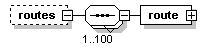 | source | <xs:element name="routes" minOccurs="0"> <xs:complexType> <xs:sequence maxOccurs="100"> <xs:element name="route" type="SCHRouteIden"/> </xs:sequence> </xs:complexType> </xs:element> |