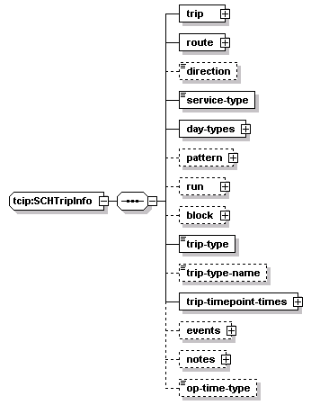 | source | <xs:complexType name="SCHTripInfo"> <xs:sequence> <xs:element name="trip" type="SCHTripIden"/> <xs:element name="route" type="SCHRouteIden"/> <xs:element name="direction" type="SCH-RouteDirectionName" minOccurs="0"/> <xs:element name="service-type" type="SCH-ServiceType"/> <xs:element name="day-types"> <xs:complexType> <xs:sequence maxOccurs="20"> <xs:element name="day-type" type="SCH-DayType"/> </xs:sequence> </xs:complexType> </xs:element> <xs:element name="pattern" type="SCHPatternIden" minOccurs="0"/> <xs:element name="run" type="SCHRunIden" minOccurs="0"/> <xs:element name="block" type="SCHBlockIden" minOccurs="0"/> <xs:element name="trip-type" type="SCH-TripType"/> <xs:element name="trip-type-name" type="SCH-TripTypeDescription" minOccurs="0"/> <xs:element name="trip-timepoint-times"> <xs:complexType> <xs:sequence maxOccurs="500"> <xs:element name="trip-timepoint-time" type="SCH-Time"/> </xs:sequence> </xs:complexType> </xs:element> <xs:element name="events" minOccurs="0"> <xs:complexType> <xs:sequence maxOccurs="500"> <xs:element name="event" type="SCHEvent"/> </xs:sequence> </xs:complexType> </xs:element> <xs:element name="notes" minOccurs="0"> <xs:complexType> <xs:sequence maxOccurs="50"> <xs:element name="note" type="SCHNoteIden"/> </xs:sequence> </xs:complexType> </xs:element> <xs:element name="op-time-type" type="SCH-OperatingTimeType" minOccurs="0"/> </xs:sequence> </xs:complexType> |
