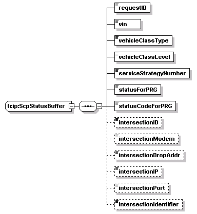 | source | <xs:complexType name="ScpStatusBuffer"> <xs:sequence> <xs:element name="requestID" type="SCP-PriorityRequestID"/> <!-- 1octet --> <xs:element name="vin" type="CPT-VIN"/> <!-- 17octets --> <xs:element name="vehicleClassType" type="SCP-VehicleClassType"/> <!-- 1octet --> <xs:element name="vehicleClassLevel" type="SCP-VehicleClassLevel"/> <!-- 1octet --> <xs:element name="serviceStrategyNumber" type="SCP-PriorityStrategyNumber"/> <!-- 1octet --> <xs:element name="statusForPRG" type="SCP-StatusForPRG"/> <!-- 1octet --> <xs:element name="statusCodeForPRG" type="SCP-StatusCodeForPRG"/> <!-- 1octet --> <xs:element name="intersectionID" type="TSP-TMS-IntersectionID" minOccurs="0"/> <xs:element name="intersectionModem" type="TSP-ModemPhoneNum" minOccurs="0"/> <xs:element name="intersectionDropAddr" type="TSP-DropAddr" minOccurs="0"/> <xs:element name="intersectionIP" type="CPT-IP-Address" minOccurs="0"/> <xs:element name="intersectionPort" type="CPT-UDP-TCP-PortNumber" minOccurs="0"/> <xs:element name="intersectionIdentifier" type="tmdd:Intersection-identifier" minOccurs="0"/> </xs:sequence> </xs:complexType> |