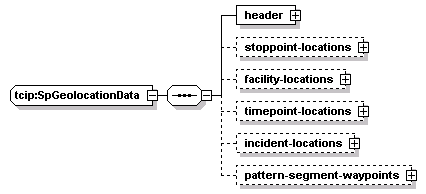 | source | <xs:complexType name="SpGeolocationData"> <xs:sequence> <xs:element name="header" type="CPTPushHeader"/> <xs:element name="stoppoint-locations" minOccurs="0"> <xs:complexType> <xs:sequence maxOccurs="25000"> <xs:element name="stoppoint-location" type="SPStopGeoLoc"/> </xs:sequence> </xs:complexType> </xs:element> <xs:element name="facility-locations" minOccurs="0"> <xs:complexType> <xs:sequence maxOccurs="1000"> <xs:element name="facility-location" type="SPFacilityGeoLoc"/> </xs:sequence> </xs:complexType> </xs:element> <xs:element name="timepoint-locations" minOccurs="0"> <xs:complexType> <xs:sequence maxOccurs="10000"> <xs:element name="timepoint-location" type="SPTimepointGeoLoc"/> </xs:sequence> </xs:complexType> </xs:element> <xs:element name="incident-locations" minOccurs="0"> <xs:complexType> <xs:sequence maxOccurs="100"> <xs:element name="incident-location" type="SPIncidentLocation"/> </xs:sequence> </xs:complexType> </xs:element> <xs:element name="pattern-segment-waypoints" minOccurs="0"> <xs:complexType> <xs:sequence maxOccurs="1000"> <xs:element name="pattern-segment-waypoint" type="SPSegmentGeolocation"/> </xs:sequence> </xs:complexType> </xs:element> </xs:sequence> </xs:complexType> |