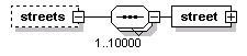 | source | <xs:element name="streets" minOccurs="0"> <xs:complexType> <xs:sequence maxOccurs="10000"> <xs:element name="street" type="lrms:StreetInfo"/> </xs:sequence> </xs:complexType> </xs:element> |