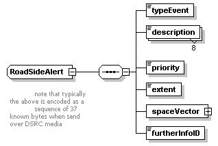 | source | <xs:complexType name="RoadSideAlert"> <xs:annotation> <xs:documentation> note that typically the above is encoded as a sequence of 37 known bytes when send over DSRC media </xs:documentation> </xs:annotation> <xs:sequence> <xs:element name="typeEvent"> <xs:simpleType> <xs:restriction base="itis:ITIScodes"/> </xs:simpleType> </xs:element> <!-- a category and an item from that category all ITS stds use the same types here to explain the type of the alert / danger / hazard involved two bytes in length --> <xs:element name="description" type="itis:ITIScodes" minOccurs="8" maxOccurs="8"/> <!-- eight ITIS code entries to further describe the event , give advice , or any other ITIS codes non used positions are set to zero 16 bytes in length --> <xs:element name="priority" type="Priority"/> <!-- the urgency of this message, a relative degree of merit compared with other similar messages for this type (not other message being sent by the device) , nor a priority of display urgency one byte in length --> <xs:element name="extent" type="Extent"/> <!-- the spatial distance over which this message applies and should be presented to the driver one byte in length --> <xs:element name="spaceVector" type="SpaceVector"/> <!-- a compact summary of the position, heading, rate of speed, etc of the event in question. Including stationary and wide area events. 15 bytes in length --> <xs:element name="furtherInfoID" type="FurtherInfoID"/> <!-- a link to any other incident information data that may be available in the normal ATIS incident description or other messages two bytes in length --> </xs:sequence> </xs:complexType> |
