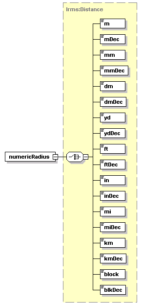 | source | <xs:complexType name="SearchRadius"> <xs:choice> <xs:element name="numericRadius" type="lrms:Distance"/> <!-- NumericRadius --> <xs:element name="geometry" type="lrms:LocationReference"/> </xs:choice> </xs:complexType> |