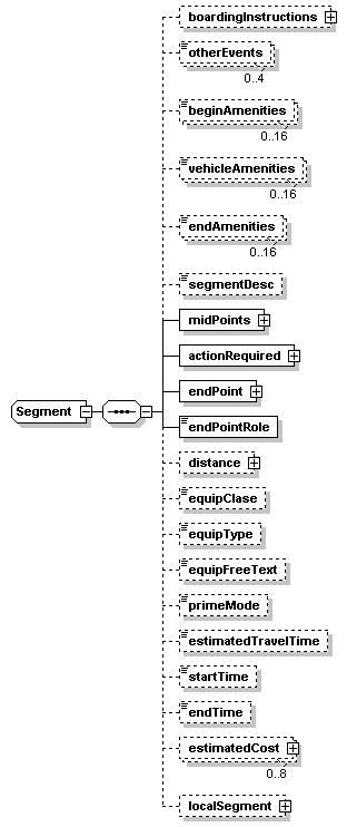 | children | boardingInstructions otherEvents beginAmenities vehicleAmenities endAmenities segmentDesc midPoints actionRequired endPoint endPointRole distance equipClase equipType equipFreeText primeMode estimatedTravelTime startTime endTime estimatedCost localSegment | ||