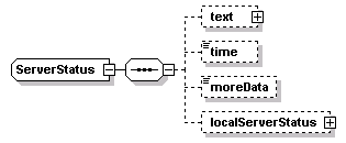 | source | <xs:complexType name="ServerStatus"> <xs:sequence> <xs:element name="text" type="itis:ITIScodesAndText" minOccurs="0"/> <xs:element name="time" type="DateTimePair" minOccurs="0"/> <!-- used to tell when services may resume --> <xs:element name="moreData" type="URL-Link" minOccurs="0"/> <xs:element name="localServerStatus" type="local:ServerStatus" minOccurs="0"/> </xs:sequence> </xs:complexType> |