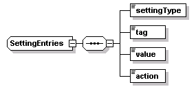 | source | <xs:complexType name="SettingEntries"> <xs:sequence> <xs:element name="settingType" type="SettingType"/> <xs:element name="tag" type="Setting-Identity"/> <xs:element name="value" type="Freetext"/> <xs:element name="action" type="SetAction"/> </xs:sequence> </xs:complexType> |