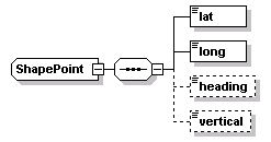 | source | <xs:complexType name="ShapePoint"> <xs:sequence> <xs:element name="lat" type="lrms:Latitude"/> <xs:element name="long" type="lrms:Longitude"/> <xs:element name="heading" type="Heading" minOccurs="0"/> <xs:element name="vertical" type="Elevation" minOccurs="0"/> </xs:sequence> </xs:complexType> |