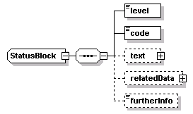 | source | <xs:complexType name="StatusBlock"> <xs:sequence> <xs:element name="level" type="Error-NotificationLevel"/> <xs:element name="code" type="Error-NotificationCode"/> <xs:element name="text" type="itis:ITIScodesAndText" minOccurs="0"/> <xs:element name="relatedData" minOccurs="0"> <xs:complexType> <xs:choice> <xs:element name="subscribe" type="RequestStatus"/> <xs:element name="route" type="RouteStatus"/> <xs:element name="server" type="ServerStatus"/> <xs:element name="localStatusBlock" type="local:StatusBlock" minOccurs="0"/> </xs:choice> </xs:complexType> </xs:element> <xs:element name="furtherInfo" type="URL-Link" minOccurs="0"/> </xs:sequence> </xs:complexType> |