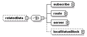 | source | <xs:element name="relatedData" minOccurs="0"> <xs:complexType> <xs:choice> <xs:element name="subscribe" type="RequestStatus"/> <xs:element name="route" type="RouteStatus"/> <xs:element name="server" type="ServerStatus"/> <xs:element name="localStatusBlock" type="local:StatusBlock" minOccurs="0"/> </xs:choice> </xs:complexType> </xs:element> |