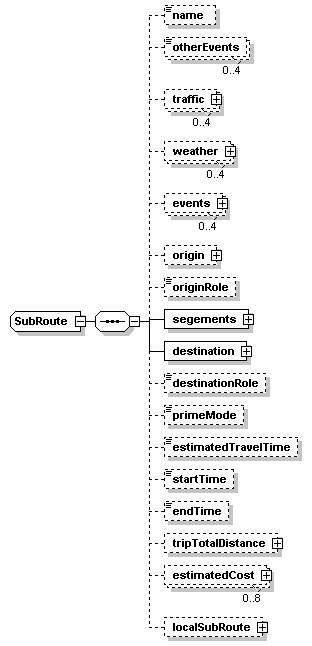 | source | <xs:complexType name="SubRoute"> <xs:sequence> <xs:element name="name" minOccurs="0"> <xs:simpleType> <xs:restriction base="xs:string"> <xs:minLength value="1"/> <xs:maxLength value="64"/> </xs:restriction> </xs:simpleType> </xs:element> <xs:element name="otherEvents" type="im:ReferenceID" minOccurs="0" maxOccurs="4"/> <xs:element name="traffic" type="LinkTrafficInformation" minOccurs="0" maxOccurs="4"/> <xs:element name="weather" type="WeatherInformation" minOccurs="0" maxOccurs="4"/> <xs:element name="events" type="ResponseGroup" minOccurs="0" maxOccurs="4"/> <xs:element name="origin" type="lrms:PointLocation" minOccurs="0"/> <xs:element name="originRole" type="PointRole" minOccurs="0"/> <xs:element name="segements"> <xs:complexType> <xs:sequence maxOccurs="50"> <xs:element name="segement" type="Segment"/> </xs:sequence> </xs:complexType> </xs:element> <xs:element name="destination" type="lrms:PointLocation"/> <xs:element name="destinationRole" type="PointRole" minOccurs="0"/> <xs:element name="primeMode" type="Mode" minOccurs="0"/> <!-- primary mode of travel --> <xs:element name="estimatedTravelTime" type="TimeInterval" minOccurs="0"/> <xs:element name="startTime" type="DateTimePair" minOccurs="0"/> <xs:element name="endTime" type="DateTimePair" minOccurs="0"/> <xs:element name="tripTotalDistance" type="lrms:Distance" minOccurs="0"/> <xs:element name="estimatedCost" type="ComplexCost" minOccurs="0" maxOccurs="8"/> <xs:element name="localSubRoute" type="local:SubRoute" minOccurs="0"/> </xs:sequence> </xs:complexType> |