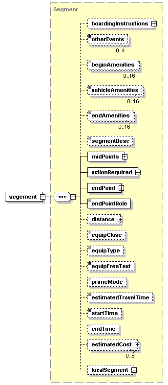 | children | boardingInstructions otherEvents beginAmenities vehicleAmenities endAmenities segmentDesc midPoints actionRequired endPoint endPointRole distance equipClase equipType equipFreeText primeMode estimatedTravelTime startTime endTime estimatedCost localSegment | ||||