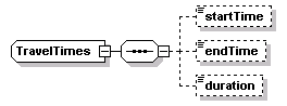 | source | <xs:complexType name="TravelTimes"> <xs:sequence> <xs:element name="startTime" type="DateTimePair" minOccurs="0"/> <xs:element name="endTime" type="DateTimePair" minOccurs="0"/> <xs:element name="duration" type="TimeInterval" minOccurs="0"/> </xs:sequence> </xs:complexType> |