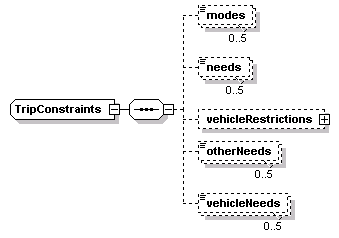 | source | <xs:complexType name="TripConstraints"> <xs:sequence> <xs:element name="modes" type="Mode" minOccurs="0" maxOccurs="5"/> <xs:element name="needs" type="ADA-Access" minOccurs="0" maxOccurs="5"/> <xs:element name="vehicleRestrictions" type="VehicleRestrictions" minOccurs="0"/> <xs:element name="otherNeeds" type="AmenitiesList" minOccurs="0" maxOccurs="5"/> <xs:element name="vehicleNeeds" type="AmenitiesList" minOccurs="0" maxOccurs="5"/> </xs:sequence> </xs:complexType> |