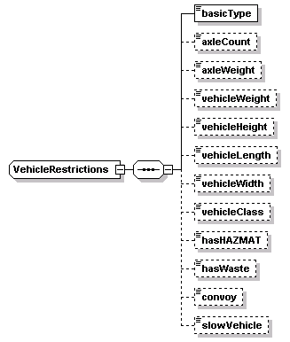 | source | <xs:complexType name="VehicleRestrictions"> <xs:sequence> <xs:element name="basicType" type="itis:VehicleGroupAffected"/> <xs:element name="axleCount" type="tmdd:Link-restriction-axle-count" minOccurs="0"/> <xs:element name="axleWeight" type="tmdd:Link-restriction-weight-axle" minOccurs="0"/> <xs:element name="vehicleWeight" type="tmdd:Link-restriction-weight-vehicle" minOccurs="0"/> <xs:element name="vehicleHeight" type="tmdd:Link-restriction-height" minOccurs="0"/> <xs:element name="vehicleLength" type="tmdd:Link-restriction-length" minOccurs="0"/> <xs:element name="vehicleWidth" type="tmdd:Link-restriction-width" minOccurs="0"/> <xs:element name="vehicleClass" type="itis:RestrictionClass" minOccurs="0"/> <xs:element name="hasHAZMAT" minOccurs="0"> <xs:simpleType> <xs:restriction base="xs:boolean"/> </xs:simpleType> </xs:element> <xs:element name="hasWaste" minOccurs="0"> <xs:simpleType> <xs:restriction base="xs:boolean"/> </xs:simpleType> </xs:element> <xs:element name="convoy" minOccurs="0"> <xs:simpleType> <xs:restriction base="xs:boolean"/> </xs:simpleType> </xs:element> <xs:element name="slowVehicle" minOccurs="0"> <xs:simpleType> <xs:restriction base="xs:boolean"/> </xs:simpleType> </xs:element> </xs:sequence> </xs:complexType> |
