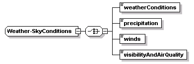 | source | <xs:complexType name="Weather-SkyConditions"> <xs:choice> <xs:element name="weatherConditions" type="itis:WeatherConditions"/> <xs:element name="precipitation" type="itis:Precipitation"/> <xs:element name="winds" type="itis:Winds"/> <xs:element name="visibilityAndAirQuality" type="itis:VisibilityAndAirQuality"/> </xs:choice> </xs:complexType> |