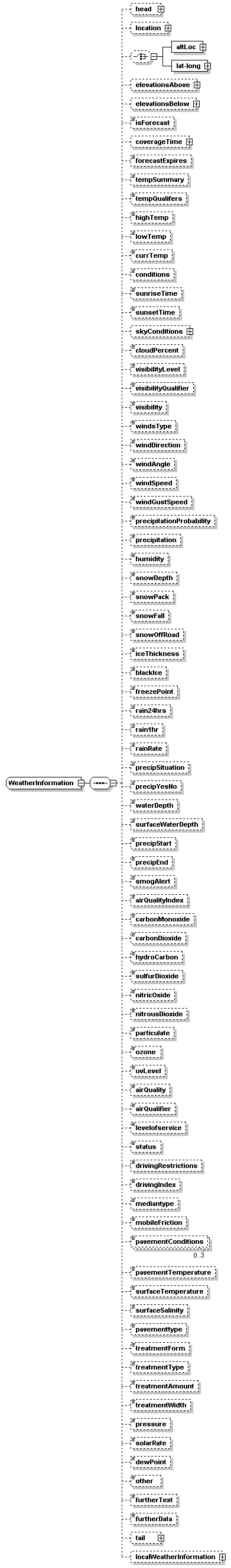 | children | head location altLoc lat-long elevationsAbove elevationsBelow isForecast coverageTime forecastExpires tempSummary tempQualifers highTemp lowTemp currTemp conditions sunriseTime sunsetTime skyConditions cloudPercent visibilityLevel visibilityQualifier visibility windsType windDirection windAngle windSpeed windGustSpeed precipitationProbability precipitation humidity snowDepth snowPack snowFall snowOffRoad iceThickness blackIce freezePoint rain24hrs rain1hr rainRate precipSituation precipYesNo waterDepth surfaceWaterDepth precipStart precipEnd smogAlert airQualityIndex carbonMonoxide carbonDioxide hydroCarbon sulfurDioxide nitricOxide nitrousDioxide particulate ozone uvLevel airQuality airQualifier levelofservice status drivingRestrictions drivingIndex mediantype mobileFriction pavementConditions pavementTemperature surfaceTemperature surfaceSalinity pavementtype treatmentForm treatmentType treatmentAmount treatmentWidth pressure solarRate dewPoint other furtherText furtherData tail localWeatherInformation | ||