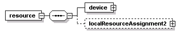 source | <xs:element name="resource"> <xs:complexType> <xs:sequence> <xs:element name="device" type="ResourceAssignment"/> <xs:element name="localResourceAssignment2" type="local:ResourceAssignment2" minOccurs="0"/> </xs:sequence> </xs:complexType> </xs:element> |