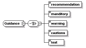 source | <xs:complexType name="Guidance"> <xs:choice> <xs:element name="recommendation" type="itis:AdviceInstructionsRecommendations"/> <xs:element name="manditory" type="itis:AdviceInstructionsMandatory"/> <xs:element name="warning" type="itis:WarningAdvice"/> <xs:element name="cautions" type="ResponderCautions"/> <xs:element name="text" type="FreeText"/> </xs:choice> </xs:complexType> |