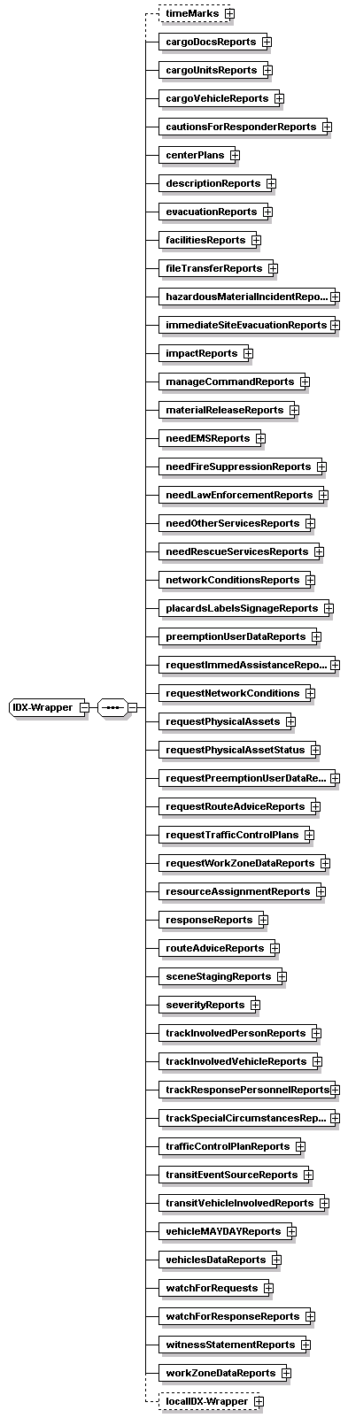 source | <xs:complexType name="IDX-Wrapper"> <xs:sequence> <xs:element name="timeMarks" type="TimeMarks" minOccurs="0"/> <!-- a collecton of event times --> <xs:element name="cargoDocsReports"> <xs:complexType> <xs:sequence minOccurs="0" maxOccurs="64"> <xs:element name="cargoDocsReport" type="CargoDocs"/> <!-- From 1512.Three --> </xs:sequence> </xs:complexType> </xs:element> <xs:element name="cargoUnitsReports"> <xs:complexType> <xs:sequence minOccurs="0" maxOccurs="64"> <xs:element name="cargoUnitsReport" type="CargoUnits"/> <!-- From 1512.Three --> </xs:sequence> </xs:complexType> </xs:element> <xs:element name="cargoVehicleReports"> <xs:complexType> <xs:sequence minOccurs="0" maxOccurs="64"> <xs:element name="cargoVehicleReport" type="CargoVehicle"/> <!-- From 1512.Three --> </xs:sequence> </xs:complexType> </xs:element> <xs:element name="cautionsForResponderReports"> <xs:complexType> <xs:sequence minOccurs="0" maxOccurs="64"> <xs:element name="cautionsForResponderReport" type="CautionsForResponders"/> <!-- From 1512.Two --> </xs:sequence> </xs:complexType> </xs:element> <xs:element name="centerPlans"> <xs:complexType> <xs:sequence minOccurs="0" maxOccurs="64"> <xs:element name="centerPlan" type="CenterPlans"/> <!-- From 1512.Base (and also a msg) --> </xs:sequence> </xs:complexType> </xs:element> <xs:element name="descriptionReports"> <xs:complexType> <xs:sequence minOccurs="0" maxOccurs="64"> <xs:element name="descriptionReport" type="Description"/> <!-- From 1512.Base --> </xs:sequence> </xs:complexType> </xs:element> <xs:element name="evacuationReports"> <xs:complexType> <xs:sequence minOccurs="0" maxOccurs="64"> <xs:element name="evacuationReport" type="Evacuation"/> <!-- From 1512.Base --> </xs:sequence> </xs:complexType> </xs:element> <xs:element name="facilitiesReports"> <xs:complexType> <xs:sequence minOccurs="0" maxOccurs="64"> <xs:element name="facilitiesReport" type="Facilities"/> <!-- From 1512.Base --> </xs:sequence> </xs:complexType> </xs:element> <xs:element name="fileTransferReports"> <xs:complexType> <xs:sequence minOccurs="0" maxOccurs="64"> <xs:element name="fileTransferReport" type="FileTransfer"/> <!-- From 1512.Base --> </xs:sequence> </xs:complexType> </xs:element> <xs:element name="hazardousMaterialIncidentReports"> <xs:complexType> <xs:sequence minOccurs="0" maxOccurs="64"> <xs:element name="hazardousMaterialIncidentReport" type="HazardousMaterialIncidentReport"/> <!-- From 1512.Three --> </xs:sequence> </xs:complexType> </xs:element> <xs:element name="immediateSiteEvacuationReports"> <xs:complexType> <xs:sequence minOccurs="0" maxOccurs="64"> <xs:element name="immediateSiteEvacuationReport" type="ImmediateSiteEvacuation"/> <!-- From 1512.Two --> </xs:sequence> </xs:complexType> </xs:element> <xs:element name="impactReports"> <xs:complexType> <xs:sequence minOccurs="0" maxOccurs="64"> <xs:element name="impactReport" type="Impact"/> <!-- From 1512.Base --> </xs:sequence> </xs:complexType> </xs:element> <xs:element name="manageCommandReports"> <xs:complexType> <xs:sequence minOccurs="0" maxOccurs="64"> <xs:element name="manageCommandReport" type="ManageCommandStructure"/> <!-- From 1512.Two (and also a msg) --> </xs:sequence> </xs:complexType> </xs:element> <xs:element name="materialReleaseReports"> <xs:complexType> <xs:sequence minOccurs="0" maxOccurs="64"> <xs:element name="materialReleaseReport" type="MaterialRelease"/> <!-- From 1512.Three --> </xs:sequence> </xs:complexType> </xs:element> <xs:element name="needEMSReports"> <xs:complexType> <xs:sequence minOccurs="0" maxOccurs="64"> <xs:element name="needEMSReport" type="NeedEMS"/> <!-- From 1512.Two --> </xs:sequence> </xs:complexType> </xs:element> <xs:element name="needFireSuppressionReports"> <xs:complexType> <xs:sequence minOccurs="0" maxOccurs="64"> <xs:element name="needFireSuppressionReport" type="NeedFireSuppression"/> <!-- From 1512.Two --> </xs:sequence> </xs:complexType> </xs:element> <xs:element name="needLawEnforcementReports"> <xs:complexType> <xs:sequence minOccurs="0" maxOccurs="64"> <xs:element name="needLawEnforcementReport" type="NeedLawEnforcement"/> <!-- From 1512.Two --> </xs:sequence> </xs:complexType> </xs:element> <xs:element name="needOtherServicesReports"> <xs:complexType> <xs:sequence minOccurs="0" maxOccurs="64"> <xs:element name="needOtherServicesReport" type="NeedOtherServices"/> <!-- From 1512.Two --> </xs:sequence> </xs:complexType> </xs:element> <xs:element name="needRescueServicesReports"> <xs:complexType> <xs:sequence minOccurs="0" maxOccurs="64"> <xs:element name="needRescueServicesReport" type="NeedRescueServices"/> <!-- From 1512.Two --> </xs:sequence> </xs:complexType> </xs:element> <xs:element name="networkConditionsReports"> <xs:complexType> <xs:sequence minOccurs="0" maxOccurs="64"> <xs:element name="networkConditionsReport" type="NetworkConditions"/> <!-- From 1512.One (and also a msg) --> </xs:sequence> </xs:complexType> </xs:element> <xs:element name="placardsLabelsSignageReports"> <xs:complexType> <xs:sequence minOccurs="0" maxOccurs="64"> <xs:element name="placardsLabelsSignageReport" type="PlacardsLabelsSignage"/> <!-- From 1512.Three --> </xs:sequence> </xs:complexType> </xs:element> <xs:element name="preemptionUserDataReports"> <xs:complexType> <xs:sequence minOccurs="0" maxOccurs="64"> <xs:element name="preemptionUserDataReport" type="PreemptionUserData"/> <!-- From 1512.One (and also a msg) --> </xs:sequence> </xs:complexType> </xs:element> <xs:element name="requestImmedAssistanceReports"> <xs:complexType> <xs:sequence minOccurs="0" maxOccurs="64"> <xs:element name="requestImmedAssistanceReport" type="RequestImmediateAssistance"/> <!-- From 1512.Two --> </xs:sequence> </xs:complexType> </xs:element> <xs:element name="requestNetworkConditions"> <xs:complexType> <xs:sequence minOccurs="0" maxOccurs="64"> <xs:element name="requestNetworkCondition" type="RequestNetworkConditions"/> <!-- From 1512.One (and also a msg) --> </xs:sequence> </xs:complexType> </