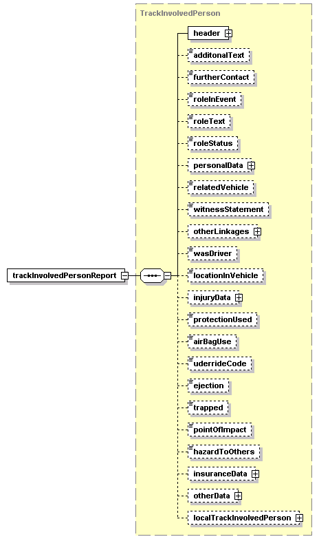 children | header additonalText furtherContact roleInEvent roleText roleStatus personalData relatedVehicle witnessStatement otherLinkages wasDriver locationInVehicle injuryData protectionUsed airBagUse uderrideCode ejection trapped pointOfImpact hazardToOthers insuranceData otherData localTrackInvolvedPerson | ||||