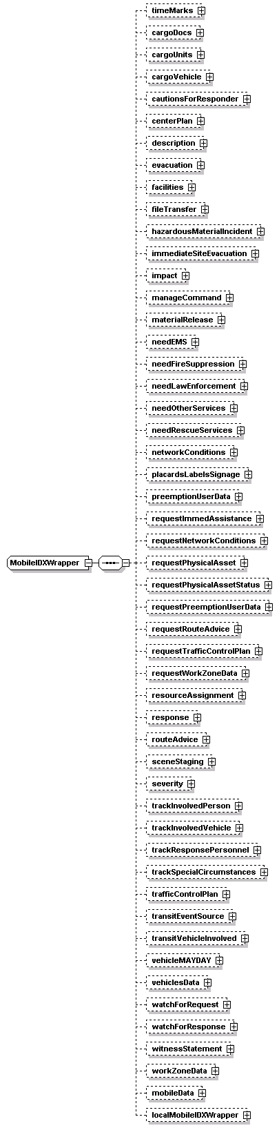 children | timeMarks cargoDocs cargoUnits cargoVehicle cautionsForResponder centerPlan description evacuation facilities fileTransfer hazardousMaterialIncident immediateSiteEvacuation impact manageCommand materialRelease needEMS needFireSuppression needLawEnforcement needOtherServices needRescueServices networkConditions placardsLabelsSignage preemptionUserData requestImmedAssistance requestNetworkConditions requestPhysicalAsset requestPhysicalAssetStatus requestPreemptionUserData requestRouteAdvice requestTrafficControlPlan requestWorkZoneData resourceAssignment response routeAdvice sceneStaging severity trackInvolvedPerson trackInvolvedVehicle trackResponsePersonnel trackSpecialCircumstances trafficControlPlan transitEventSource transitVehicleInvolved vehicleMAYDAY vehiclesData watchForRequest watchForResponse witnessStatement workZoneData mobileData localMobileIDXWrapper | ||