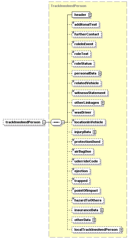 children | header additonalText furtherContact roleInEvent roleText roleStatus personalData relatedVehicle witnessStatement otherLinkages wasDriver locationInVehicle injuryData protectionUsed airBagUse uderrideCode ejection trapped pointOfImpact hazardToOthers insuranceData otherData localTrackInvolvedPerson | ||||||||