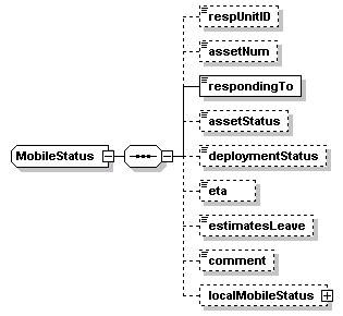 source | <xs:complexType name="MobileStatus"> <xs:sequence> <xs:element name="respUnitID" type="ReferenceID" minOccurs="0"/> <!-- the object reference for this resource --> <xs:element name="assetNum" type="CenterAssetPermRef" minOccurs="0"/> <!-- the owning centers perm ID for the asset --> <xs:element name="respondingTo" type="ReferenceID"/> <!-- the object reference (event) to which this message relates --> <xs:element name="assetStatus" type="itis:AssetStatus" minOccurs="0"/> <!-- various routine status states --> <xs:element name="deploymentStatus" type="DeploymentStatus" minOccurs="0"/> <!-- the status of the asset with respect to the base from which it is dispatched --> <xs:element name="eta" type="atis:DateTimePair" minOccurs="0"/> <!-- the resources view of the ETA at the destinationLoc --> <xs:element name="estimatesLeave" type="atis:DateTimePair" minOccurs="0"/> <!-- estimate of when resource will leave destinationLoc --> <xs:element name="comment" type="FreeText" minOccurs="0"/> <!-- free form comment text --> <xs:element name="localMobileStatus" type="local:MobileStatus" minOccurs="0"/> </xs:sequence> </xs:complexType> |