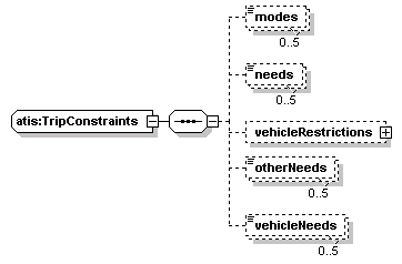 source | <xs:complexType name="TripConstraints"> <xs:sequence> <xs:element name="modes" type="Mode" minOccurs="0" maxOccurs="5"/> <xs:element name="needs" type="ADA-Access" minOccurs="0" maxOccurs="5"/> <xs:element name="vehicleRestrictions" type="VehicleRestrictions" minOccurs="0"/> <xs:element name="otherNeeds" type="AmenitiesList" minOccurs="0" maxOccurs="5"/> <xs:element name="vehicleNeeds" type="AmenitiesList" minOccurs="0" maxOccurs="5"/> </xs:sequence> </xs:complexType> |