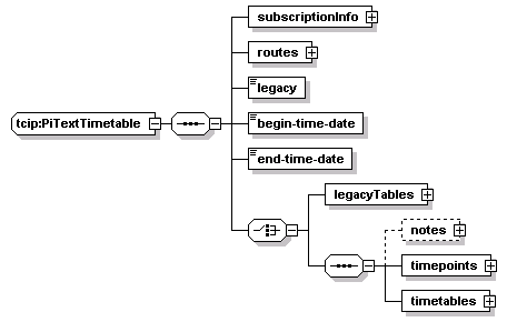 source | <xs:complexType name="PiTextTimetable"> <xs:sequence> <xs:element name="subscriptionInfo" type="CPTSubscriptionHeader"/> <xs:element name="routes"> <xs:complexType> <xs:sequence maxOccurs="1000"> <xs:element name="route" type="SCHRouteIden"/> </xs:sequence> </xs:complexType> </xs:element> <xs:element name="legacy" type="CPT-Boolean"/> <xs:element name="begin-time-date" type="CPT-DateTime"/> <xs:element name="end-time-date" type="CPT-DateTime"/> <xs:choice> <xs:element name="legacyTables"> <xs:complexType> <xs:sequence maxOccurs="1000"> <xs:element name="legacyTable" type="PIPublishedSchedule"/> </xs:sequence> </xs:complexType> </xs:element> <xs:sequence> <xs:element name="notes" minOccurs="0"> <xs:complexType> <xs:sequence maxOccurs="1000"> <xs:element name="note" type="SCHNoteInfo"/> <!-- notes for all included timetables --> </xs:sequence> </xs:complexType> </xs:element> <xs:element name="timepoints"> <xs:complexType> <xs:sequence maxOccurs="10000"> <xs:element name="timepoint" type="PITimetableTimepoint"/> </xs:sequence> </xs:complexType> </xs:element> <xs:element name="timetables"> <xs:complexType> <xs:sequence maxOccurs="1000"> <xs:element name="timetable" type="PIXMLTimetable"/> </xs:sequence> </xs:complexType> </xs:element> </xs:sequence> </xs:choice> </xs:sequence> </xs:complexType> |