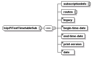source | <xs:complexType name="PiTextTimetableSub"> <xs:sequence> <xs:element name="subscriptionInfo" type="CPTSubscriptionHeader"/> <xs:element name="routes"> <xs:complexType> <xs:sequence maxOccurs="1000"> <xs:element name="route" type="SCHRouteIden"/> </xs:sequence> </xs:complexType> </xs:element> <xs:element name="legacy" type="CPT-Boolean"/> <xs:element name="begin-time-date" type="CPT-DateTime"/> <xs:element name="end-time-date" type="CPT-DateTime"/> <xs:element name="print-version" type="CPT-Boolean"/> <xs:element name="date" type="CPT-Date"/> </xs:sequence> </xs:complexType> |