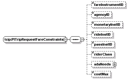 source | <xs:complexType name="PITripRequestFareConstraints"> <xs:sequence> <xs:element name="fareInstrumentID" type="FC-FareInstrID" minOccurs="0"/> <xs:element name="agencyID" type="CPT-AgencyID" minOccurs="0"/> <!-- owner of fare media --> <xs:element name="monetaryInstID" type="FC-MonetaryInstrType" minOccurs="0"/> <xs:element name="rideInstID" type="FC-RideInstrID" minOccurs="0"/> <xs:element name="passInstID" type="FC-PassInstrID" minOccurs="0"/> <xs:element name="riderClass" type="atis:TravelerClass" minOccurs="0"/> <xs:element name="adaNeeds" minOccurs="0"> <xs:complexType> <xs:sequence maxOccurs="10"> <xs:element name="adaNeed" type="PI-ADANeed"/> </xs:sequence> </xs:complexType> </xs:element> <xs:element name="costMax" type="PI-MaxCost" minOccurs="0"/> </xs:sequence> </xs:complexType> |
