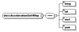 source | <xs:complexType name="AccelerationSet4Way"> <xs:sequence> <xs:element name="long" type="Acceleration"/> <!-- Along the Vehicle Longitudinal axis --> <xs:element name="lat" type="Acceleration"/> <!-- Along the Vehicle Lateral axis --> <xs:element name="vert" type="VerticalAcceleration"/> <!-- Along the Vehicle Vertical axis --> <xs:element name="yaw" type="YawRate"/> </xs:sequence> </xs:complexType> |
