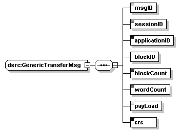 source | <xs:complexType name="GenericTransferMsg"> <xs:sequence> <xs:element name="msgID" type="DSRCmsgID"/> <!-- App ID value, 1 byte --> <xs:element name="sessionID"> <xs:simpleType> <xs:restriction base="xs:unsignedByte"/> </xs:simpleType> </xs:element> <xs:element name="applicationID"> <xs:simpleType> <xs:restriction base="xs:unsignedShort"/> </xs:simpleType> </xs:element> <xs:element name="blockID"> <xs:simpleType> <xs:restriction base="xs:unsignedShort"/> </xs:simpleType> </xs:element> <!-- the block number which this is --> <xs:element name="blockCount"> <xs:simpleType> <xs:restriction base="xs:unsignedShort"/> </xs:simpleType> </xs:element> <!-- the number of blocks in total --> <xs:element name="wordCount"> <xs:simpleType> <xs:restriction base="xs:unsignedShort"/> </xs:simpleType> </xs:element> <!-- the number of bytes in this payload --> <xs:element name="payLoad" type="PayloadData"/> <!-- the payload data to be transferred --> <xs:element name="crc"> <xs:simpleType> <xs:restriction base="xs:unsignedShort"/> </xs:simpleType> </xs:element> <!-- a CRC, if not provided by the framing --> </xs:sequence> </xs:complexType> |